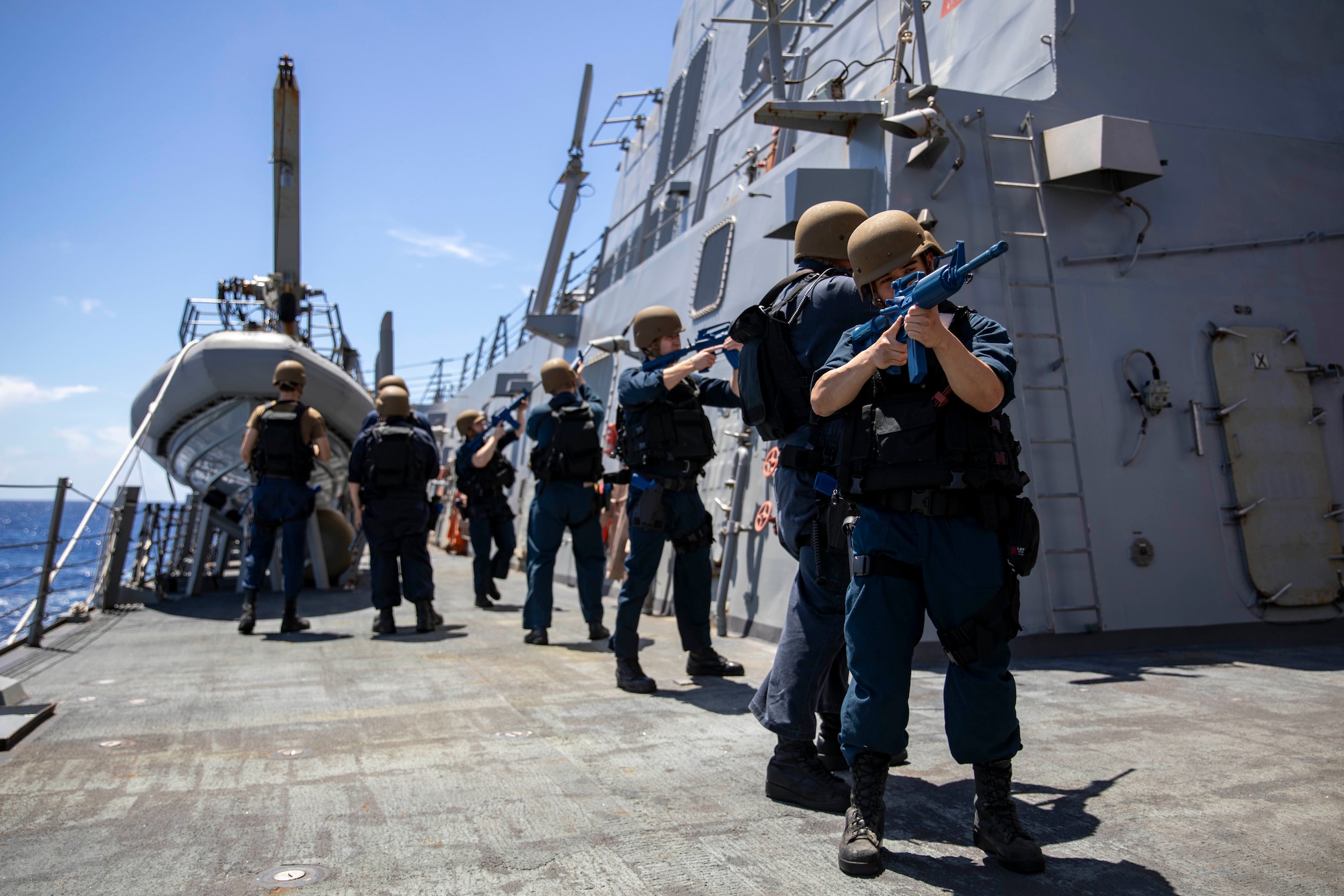 SOUTH CHINA SEA (June 12, 2024) Sailors assigned to the Arleigh Burke-class guided-missile destroyer USS Ralph Johnson (DDG 114) participate in a visit, board, search and seizure exercise, June 12, 2024. Ralph Johnson, part of Carrier Strike Group Nine, is underway conducting routine operations in the U.S. 7th Fleet area of operations. U.S. 7th Fleet is the U.S. Navy’s largest forward-deployed numbered fleet, and routinely interacts and operates with allies and partners in preserving a free and open Indo-Pacific region. (U.S. Navy photo by Mass Communication Specialist 1st Class Jamaal Liddell)
