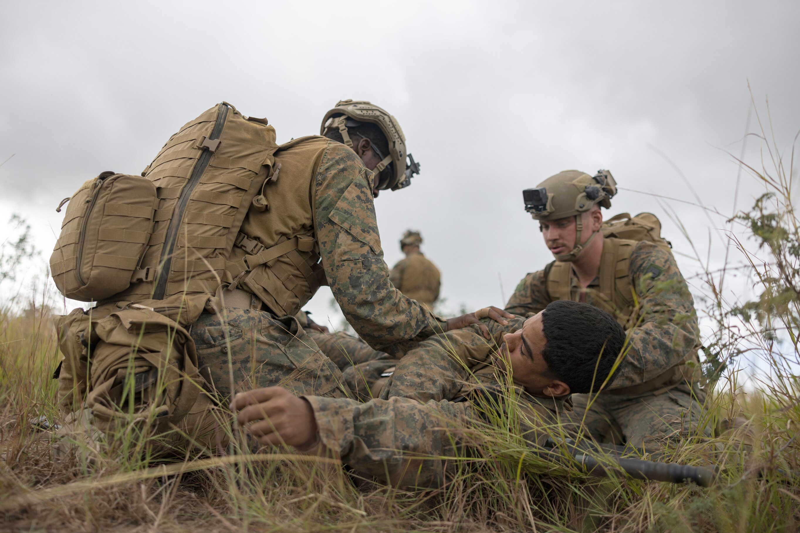 QUEENSLAND, Australia (May 30, 2024) U.S. Navy Hospital Corpsman 3rd Class Johnathan Fontenelle, left, and Hospital Corpsman 3rd Class Dylan Albright provide aid to simulated casualty U.S. Marine Corps Cpl. Ian Cruz, a rifleman, all with Golf Company, 2nd Battalion, 5th Marine Regiment (Reinforced), Marine Rotational Force – Darwin 24.3, during Exercise Southern Jackaroo 24 at Townsville Field Training Area, Queensland, Australia, May 30, 2024. Members of MRF-D 24.3 deployed to TFTA to participate in Exercise Southern Jackaroo 24, a multilateral combined arms exercise held with capabilities and personnel from the Australian Army, U.S. Army and Marine Corps, Papua New Guinea Defence Force, and the Japanese Ground Self-Defense Force to increase interoperability with Allies and partners. Fontenelle is a native of Georgia. Albright is a native of Ohio. Cruz is a native of Puerto Rico. (U.S. Marine Corps photo by Cpl. Earik Barton)