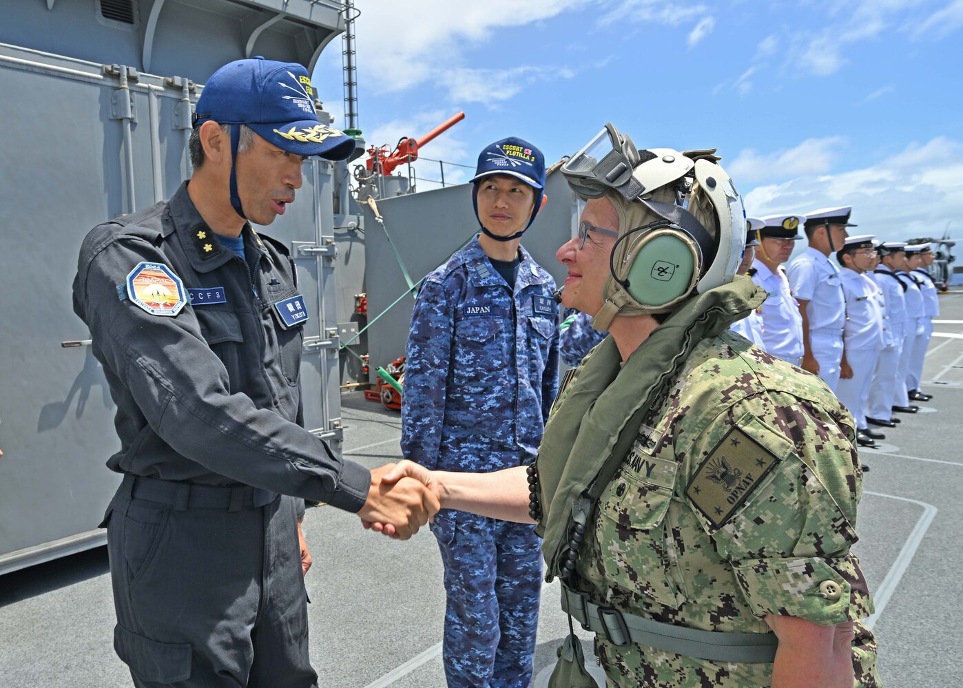 Japan Maritime Self-Defense Force (JMSDF) Rear Adm. Kazushi Yokota, commander, JMSDF Escort Flotilla Three and Exercise Rim of the Pacific (RIMPAC) 2024 Combined Task Force Vice Commander, left, greets U.S. Navy Chief of Naval Operations Adm. Lisa Franchetti, right, hand as she arrives aboard JS Kunisaki (LST-4003), July 11. Twenty-nine nations, 40 surface ships, three submarines, 14 national land forces, more than 150 aircraft and 25,000 personnel are participating in RIMPAC in and around the Hawaiian Islands, June 27 to Aug. 1. The world`s largest international maritime exercise, RIMPAC provides a unique training opportunity while fostering and sustaining cooperative relationships among participants critical to ensuring the safety of sea lanes and security on the world`s oceans. RIMPAC 2024 is the 29th exercise in the series that began in 1971.(Japan Maritime Self-Defense Force Photo by Petty Officer 3rd Class Keigo Sugiura)