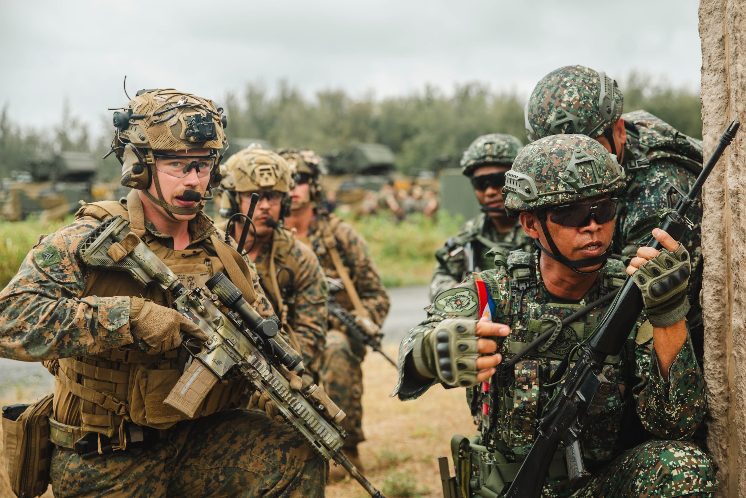 U.S. Marine Corps Cpl. Mitchell Cooke, left, an assistant patrol leader assigned to Light Armored Reconnaissance Company, Battalion Landing Team 1/5, 15th Marine Expeditionary Unit, and a native of Wisconsin, directs Philippine marines to move into a building while participating in a mechanized infantry immersion training at Marine Corps Training Area Bellows, Waimanalo, Hawaii, during Exercise Rim of the Pacific (RIMPAC) 2024, July 13. Twenty-nine nations, 40 surface ships, three submarines, 14 national land forces, more than 150 aircraft, and 25,000 personnel are participating in and around the Hawaiian Islands June 27 to Aug. 1. The world's largest international maritime exercise; RIMPAC provides a unique training opportunity while fostering and sustaining cooperative relationships among participants critical to ensuring the safety of sea lanes and security on the world's oceans. RIMPAC 2024 is the 29th exercise in the series that began in 1971. (U.S. Marine Corps photo by Cpl. Luis Agostini)