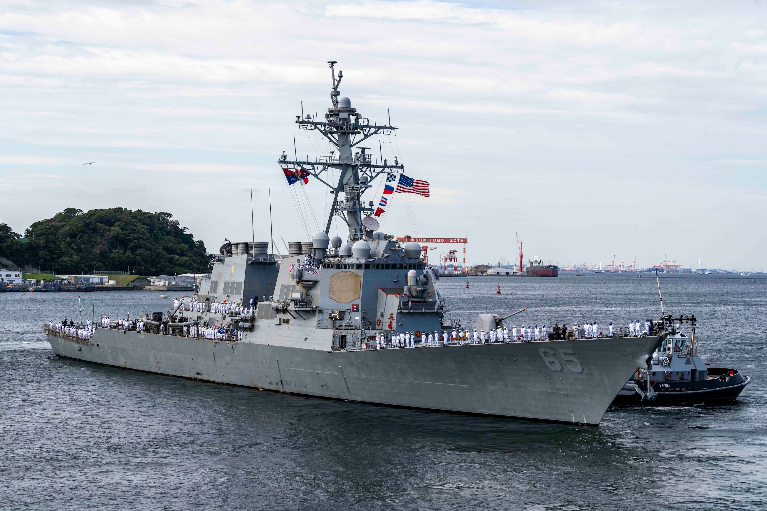YOKOSUKA, Japan (Sept. 29, 2025) – Sailors assigned to the Arleigh Burke-class guided-missile destroyer USS Benfold (DDG 65) man the rails as the ship departs Commander, Fleet Activities Yokosuka, Japan, Sept. 29, following 10 consecutive years of forward-deployed service in the U.S. 7th Fleet area of operations. Benfold is forward deployed and assigned to Destroyer Squadron (DESRON) 15, the Navy’s Largest DESRON and U.S. 7th Fleet’s principal surface force. (U.S. Navy Photo by Chief Mass Communication Specialist Taylor DiMartino)