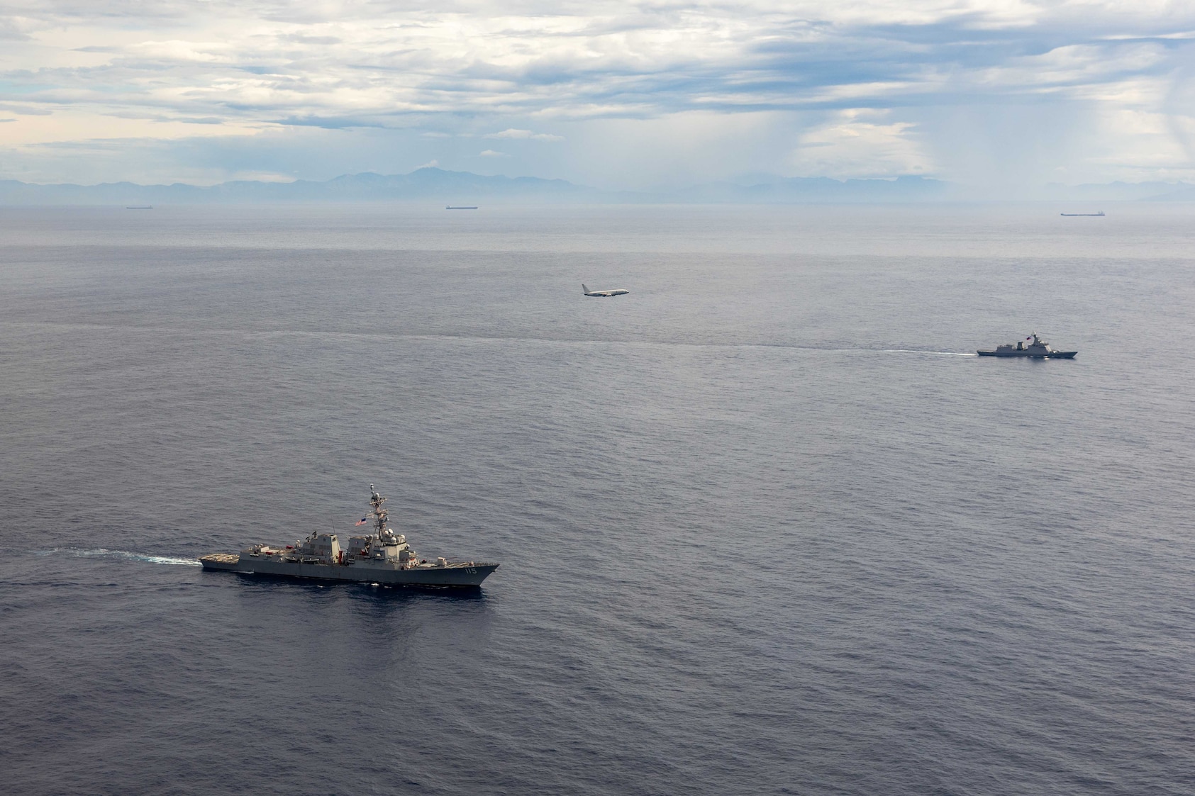 251210-N-KW492-1138 South China Sea (Dec. 10, 2025) – U.S. Navy P-8A Poseidon, assigned to Patrol Squadron (VP) 45, executes a low-altitude flyover as U.S. Navy Arleigh Burke-class guided-missile destroyer USS Rafael Peralta (DDG 115) steams in formation with Philippine Navy Jose Rizal-class frigate BRP Jose Rizal (FF 150) in the South China Sea, Dec. 10. Within the U.S. 7th Fleet area of operations, Commander, Task Force (CTF) 76 is responsible for conducting expeditionary warfare operations with Navy and Marine Corps capabilities to support theater contingencies that range from crisis response to full combat operations. (U.S. Navy photo by Mass Communication Specialist 1st Class Ryre Arciaga)