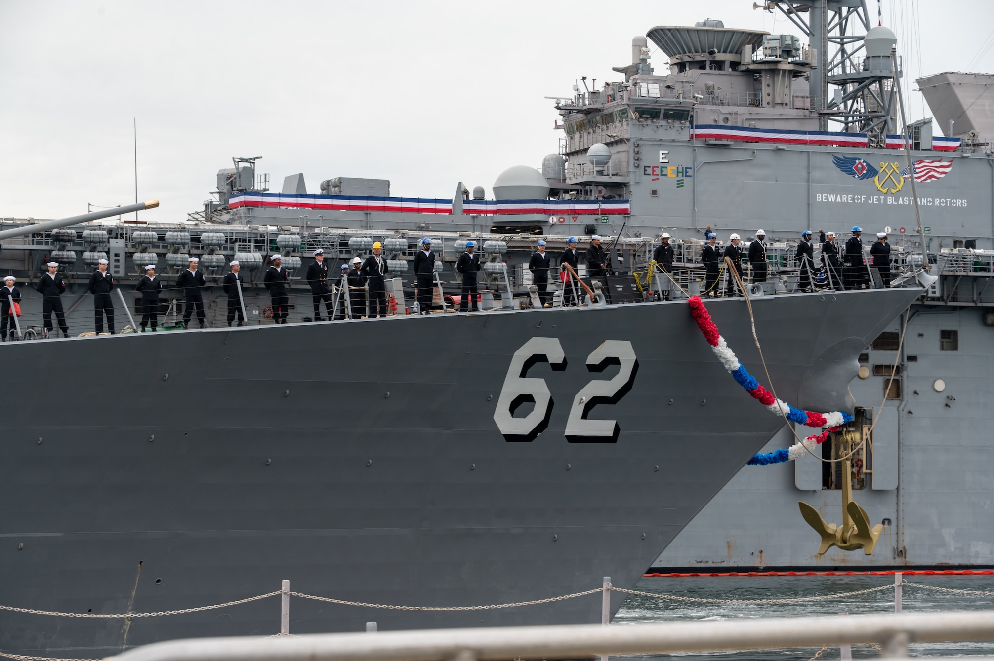 Sailors assigned to the Arleigh Burke-class guided-missile destroyer USS Fitzgerald (DDG 62) man the rails as the ship returns to its homeport of Naval Base San Diego following operations in the U.S. 3rd, 5th and 7th Fleets, Jan. 6, 2025. An integral part of the U.S. Pacific Fleet, U.S. 3rd Fleet leads naval forces in the Indo-Pacific and provides the realistic, relevant training necessary to execute the U.S. Navy's role across the full spectrum of military operations. U.S. 3rd Fleet works together with allies and partners to advance freedom of navigation and overflight, the rule of law and other principles that underpin security for the Indo-Pacific region. (U.S. Navy photo by Mass Communication Specialist 2nd Class Lordin Kelly)