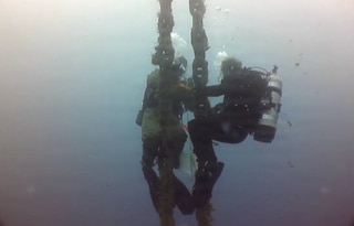 U.S. Navy Seabee divers, assigned to Underwater Construction Team One (UCT 1) Construction Dive Detachment Bravo (CDD/B), clean a riser chain in order to visually inspect and take measurements during a dive at the NATO Marathi Pier Complex in Souda Bay, Greece, Dec. 9, 2025.