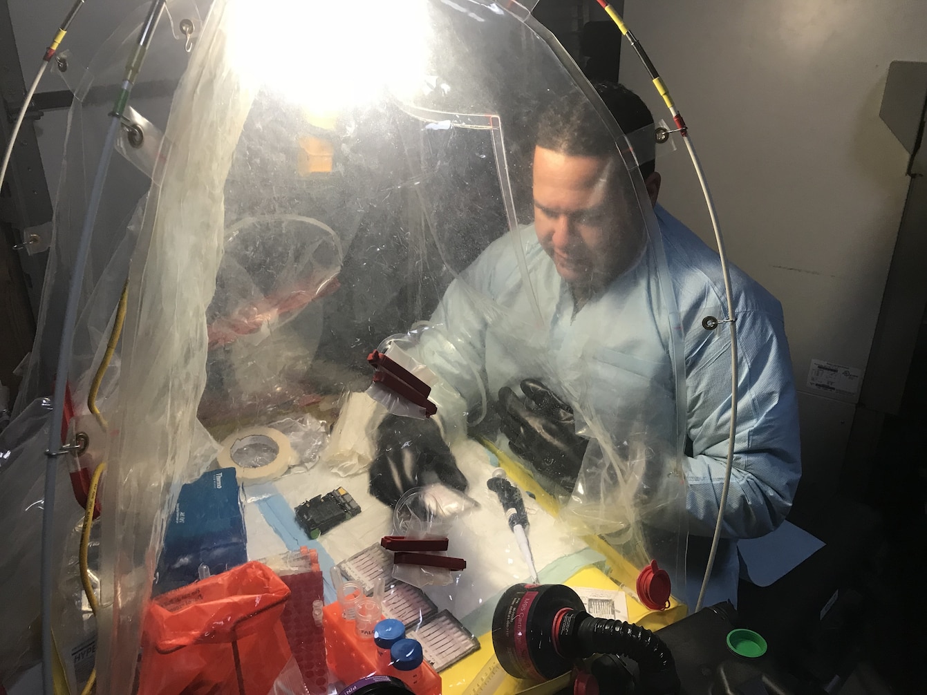 Lt. Cmdr. Elih M. Velazquez-Delgado, a biochemist assigned as the officer in charge for the Navy’s premier fly-away biowarfare agent detection laboratory in support of Chairman of the Joint Chiefs of Staff Priority-One Classified Mission, implementing cutting edge biosurveillance and detection capabilities within Navy operational forces, the National Guard Civil Support Teams, U.S. Marine Chemical and Biological Incident Response Forces and State Public Health Laboratories Incident Response at the Naval Medical Research Laboratory’s Biological Defense Research Directorate in Frederick Md., Mar. 7, 2018. (U.S. Navy photo)