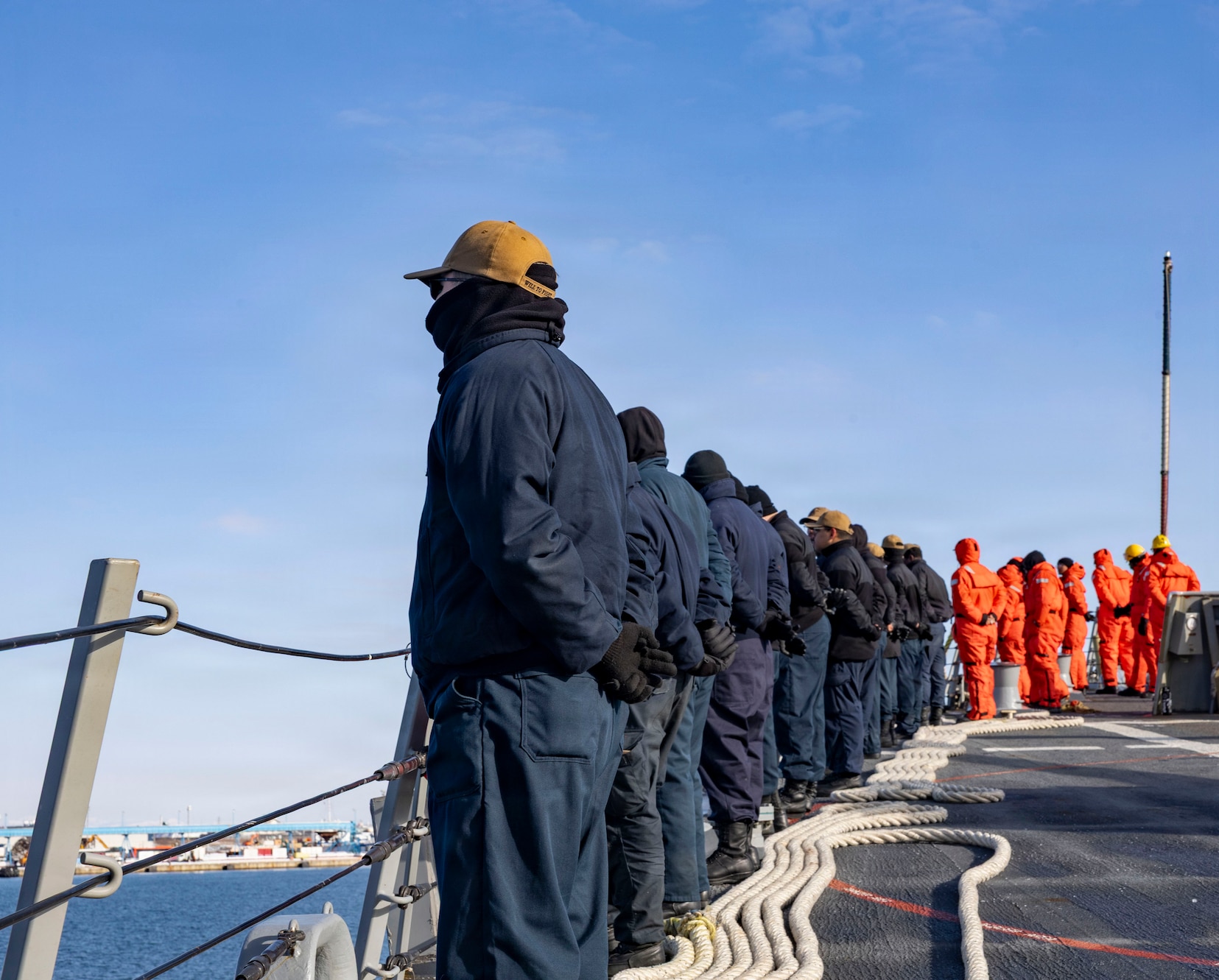 260129-N-JJ672-1117 U.S. Navy Sailors man the rails along the fo’c’sle aboard Arleigh Burke-class missile-guided destroyer USS Dewey (DDG 105), during a sea and anchor evolution off the coast of Kushiro, Japan, Jan. 29, 2026. Dewey is forward-deployed and assigned to Destroyer Squadron (DESRON) 15, the Navy’s largest DESRON and the U.S. 7th Fleet’s principal surface force. (U.S. Navy photo by Mass Communication Specialist 2nd Class Oscar Diaz)