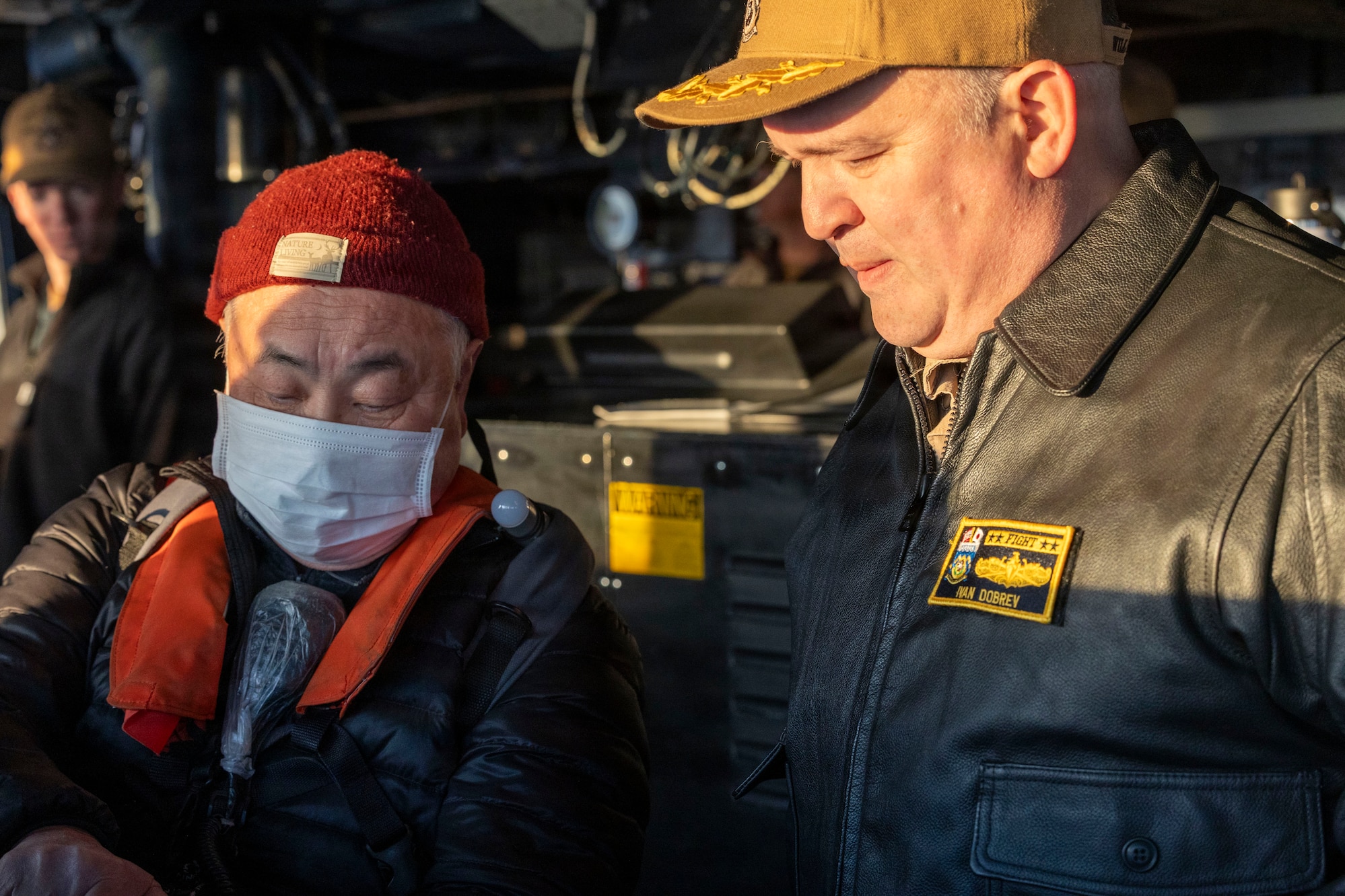 260201-N-JJ672-1075 U.S. Navy Cmdr. Ivan Dobrev, commanding officer of Arleigh Burke-class guided-missile destroyer USS Dewey (DDG 105), right, collaborates with a local harbor pilot during a sea and anchor evolution off the coast of Kushiro, Japan, Feb. 1, 2026. Dewey is forward-deployed and assigned to Destroyer Squadron (DESRON) 15, the Navy’s largest DESRON and the U.S. 7th Fleet’s principal surface force. (U.S. Navy photo by Mass Communication Specialist 2nd Class Oscar Diaz)