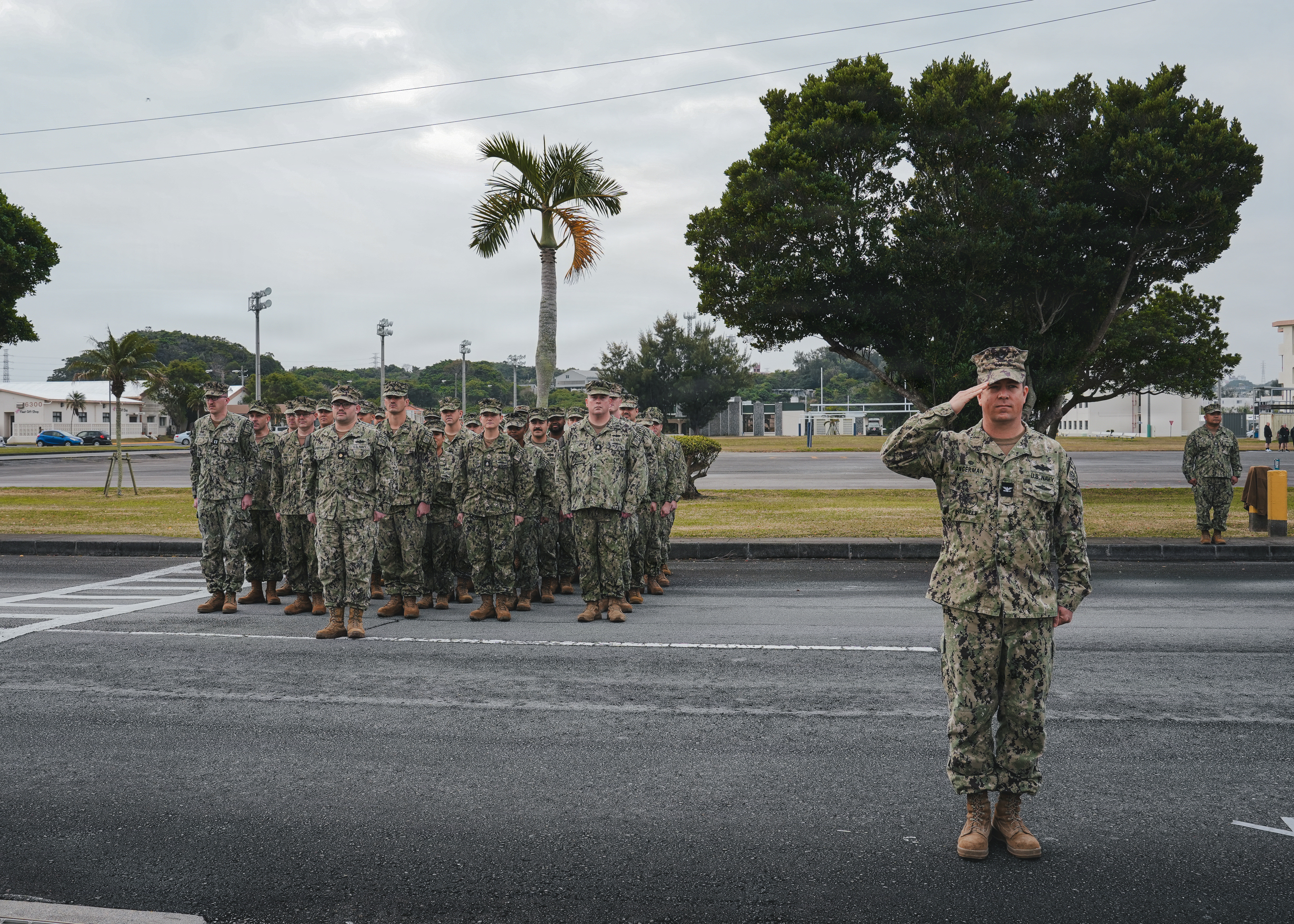 Captain James Angerman (right) Commanding Officer of Naval Mobile Construction Battalion (NMCB) 11, salutes as the battalion flag is raised during the Relief-in-Place / Transfer-of-Authority (RIPTOA) ceremony from NMCB 4 to NMCB 11 on Camp Shields, Okinawa, Japan, Feb. 02, 2026. NMCB 11 is forward deployed under Commander, Task Force 75, which executes command and control of assigned Naval Expeditionary Combat Forces across the 7th Fleet area of operations to defend U.S. allied and partner interest. (U.S. Navy Photo by Mass Communication Specialist 2nd Class Alexa H. Trafton)
