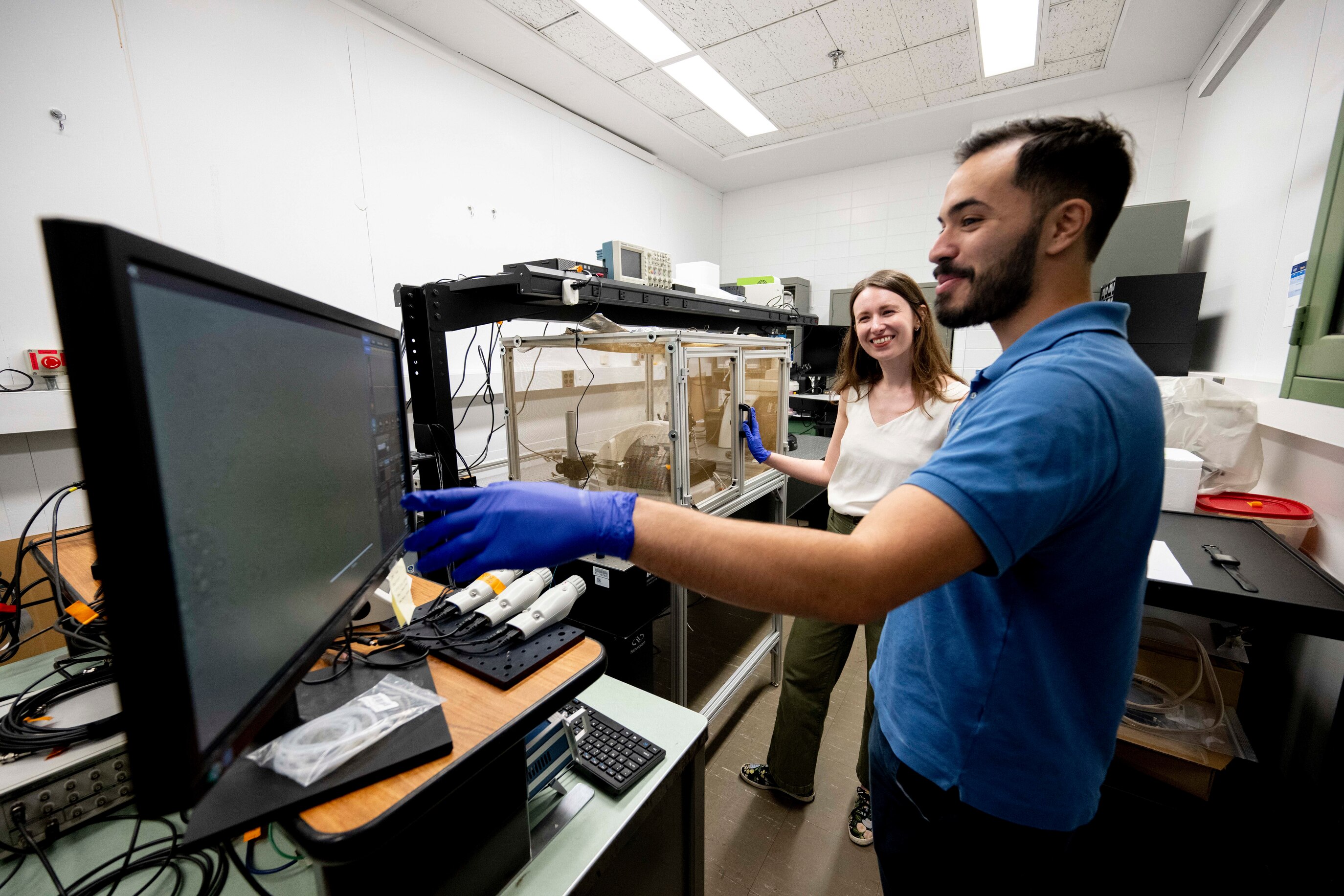 Harrison Cole (right), U.S. Naval Research Laboratory (NRL) intern, looks at images of neurons taken with an inverted microscope with Margaret Stevens, Ph.D., NRL electrical engineer, in Washington, D.C., Aug. 8, 2025. Cole participated in NRL’s Science and Engineering Apprentice Program where students work alongside researchers, attend program seminars, and deliver research presentations while exploring careers in science and technology. (U.S. Navy photo by Jonathan Steffen-Arnold)