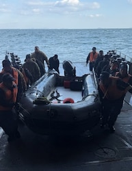 Sailors assigned to Explosive Ordnance Disposal Mobile Unit (EODMU) 5 and Japan Maritime Self-Defense Force (JMSDF) EOD teams return to the Uraga-class mine countermeasure vessel JS Bungo (MST-464) after completing unmanned underwater vehicle operations during Mine Warfare Exercise (MINEX) 1JA, Feb. 2, 2026. MINEX 1JA is part of a year-long series of bilateral exercise between the U.S. Navy and JMSDF to strengthen interoperability and increase proficiency in mine countermeasure operations. (U.S. Navy photo by Senior Chief Minemen Chris Gonzales Bouton)