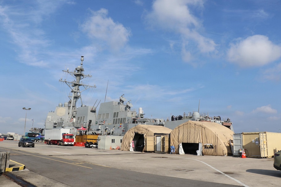 Arleigh Burke-class guided-missile destroyer USS Pinckney (DDG 91) is pier-side at Changi Naval Base as part of ship repair and maintenance exercise in Singapore, Jan. 28, 2026. Ship repair and maintenance exercise is designed to rehearse coordination and execution of ship damage repair from forward locations within the Indo-Pacific region, strengthening ties with the skilled workforce within allied and partner countries. A testament to the excellent and longstanding defense relationship between Singapore and the U.S. is the agreement allowing U.S. Navy ships to transit in Singapore for logistics and maintenance requirements. (U.S. Navy photo by Ens. Ivan Pang)