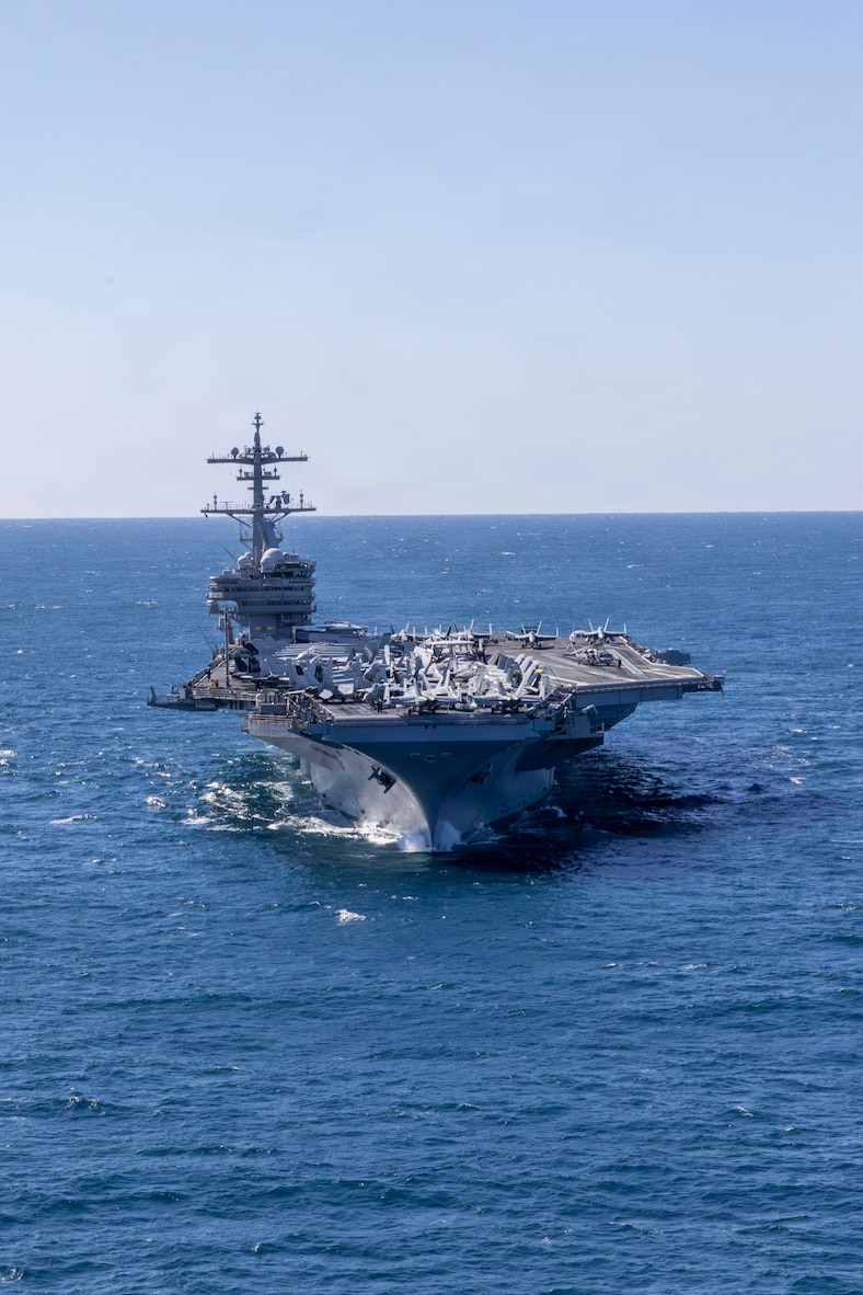 The Nimitz-class aircraft carrier USS George H.W. Bush transits the Atlantic Ocean, Feb. 8, 2026. The George H.W. Bush Carrier Strike Group is at sea training as an integrated warfighting team. Composite Training Unit Exercise (COMPTUEX) is the Joint Force’s most complex integrated training event and prepares naval task forces for sustained high-end Joint and combined combat. Integrated naval training provides combatant commanders and America’s civilian leaders highly capable forces that deter adversaries, underpin American security and economic prosperity, and reassure Allies and partners. (U.S. Navy photo by Mass Communication Specialist 2nd Class Jayden Brown)