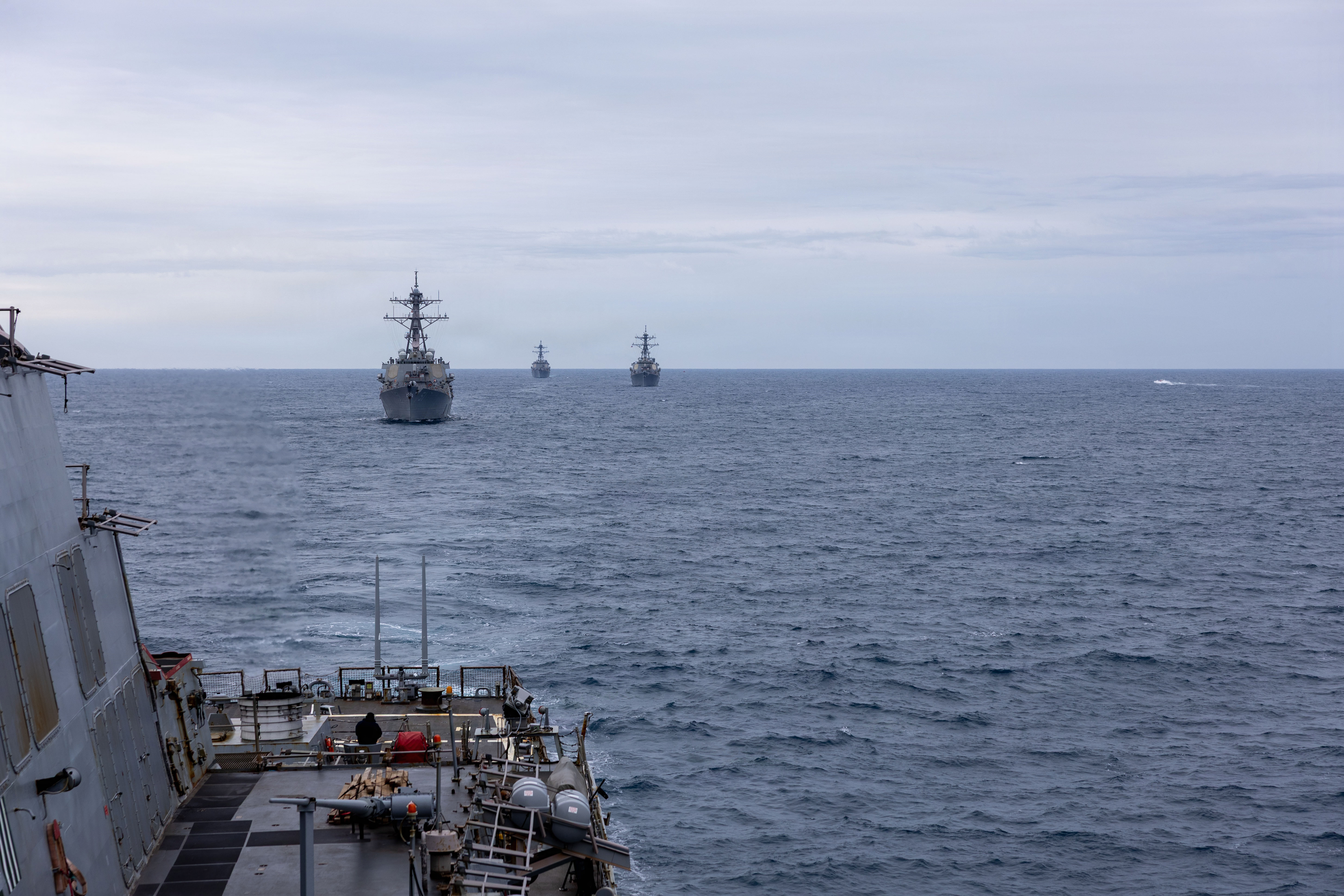 The Arleigh Burke-class guided-missile destroyer USS Gonzalez (DDG 66) sails in formation with the George H.W. Bush carrier strike group in the Atlantic Ocean, Feb. 4, 2026. The George H.W. Bush Carrier Strike Group is at sea training as an integrated warfighting team. Composite Training Unit Exercise (COMPTUEX) is the Joint Force's most complex integrated training event and prepares naval task forces for sustained high-end Joint and combined combat. Integrated naval training provides combatant commanders and America's civilian leaders highly capable forces that deter adversaries, underpin American security and economic prosperity, and reassure Allies and partners. (U.S. Navy photo by Mass Communication Specialist 3rd Class Mark Peña)