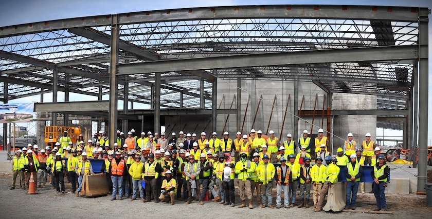 Stakeholders, engineers, and construction crew members pose for a group photo in front of the new Nuclear Regional Maintenance Department facility at Naval Submarine Base Kings Bay, Ga., Jan. 29, 2026. The group gathered to celebrate a topping out ceremony, marking a major construction milestone for the project.