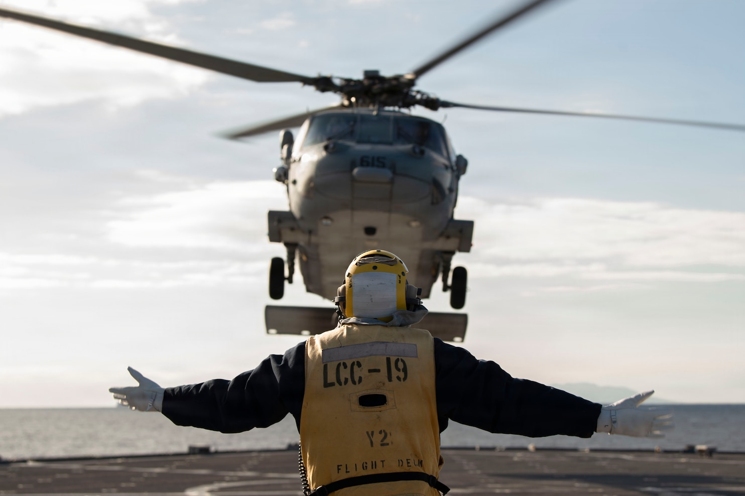 SAGAMI WAN (Feb. 19, 2026) – Boatswains Mate 2nd Class Bryce Houck communicates to the pilots of a MH-60S Seahawk helicopter assigned to the “Golden Falcons” of Helicopter Sea Combat Squadron (HSC) 12 during flight quarters aboard U.S. 7th Fleet flagship USS Blue Ridge (LCC 19) in Sagami Wan, Feb. 19, 2026. Blue Ridge and embarked U.S. 7th Fleet staff conduct regular Indo-Pacific patrols to deter aggression, strengthen alliances and partnerships, and advance future warfighting capabilities. (U.S. Navy photo by Mass Communication Specialist Seaman Zachary Del Rio)