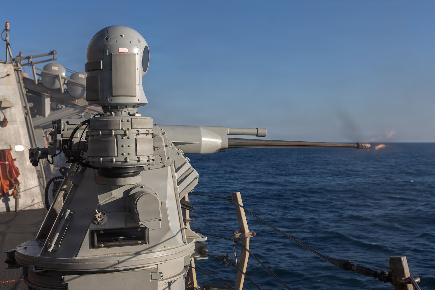A 25mm MK38 machine gun is remotely fired during a live-fire exercise aboard the Arleigh Burke-class guided-missile destroyer USS Gonzalez (DDG 66) while underway in the Atlantic Ocean, Feb. 10, 2026. The George H.W. Bush Carrier Strike Group is at sea training as an integrated warfighting team. Composite Training Unit Exercise (COMPTUEX) is the Joint Force's most complex integrated training event and prepares naval task forces for sustained high-end Joint and combined combat. Integrated naval training provides combatant commanders and America's civilian leaders highly capable forces that deter adversaries, underpin American security and economic prosperity, and reassure Allies and partners. (U.S. Navy photo by Mass Communication Specialist 3rd Class Mark Peña)