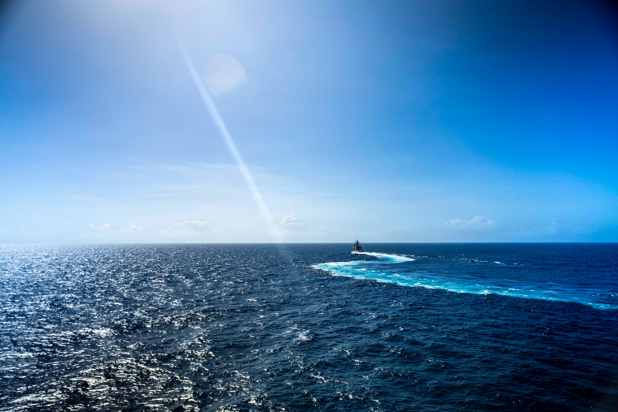 Ticonderoga class guided-missile cruiser USS Lake Erie (CG 70) breaks away from the Wasp-class amphibious assault ship USS Iwo Jima (LHD 7) after a replenishment-at-sea while underway in the Caribbean Sea, Feb. 3, 2026. U.S. military forces are deployed to the Caribbean in support of the U.S. Southern Command mission, Department of War-directed operations, and the president’s priorities to disrupt illicit drug trafficking and protect the homeland. (U.S. Navy photo)