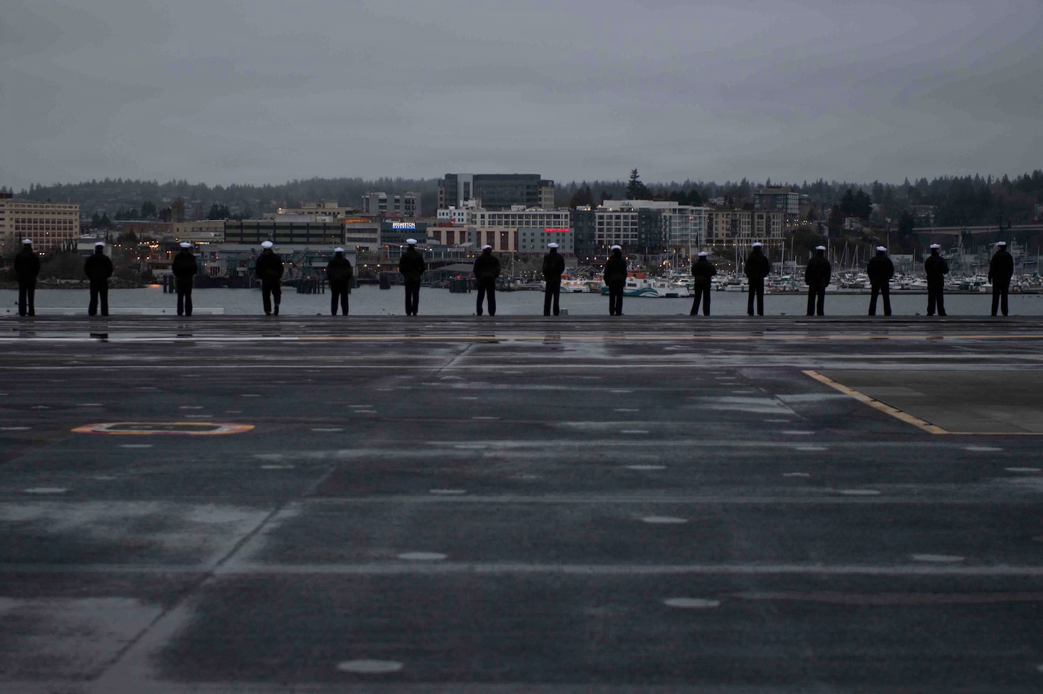 U.S. Sailors man the rails aboard Nimitz-class aircraft carrier USS Nimitz (CVN 68) during the ship's final departure from Naval Base Kitsap-Bremerton, Washington, Mar. 7, 2026. Nimitz is underway in the U.S. 3rd Fleet area of operations as part of a scheduled home port shift to Norfolk, Virginia. (U.S. Navy photo by Mass Communication Specialist Seaman Apprentice Julian Jaime)