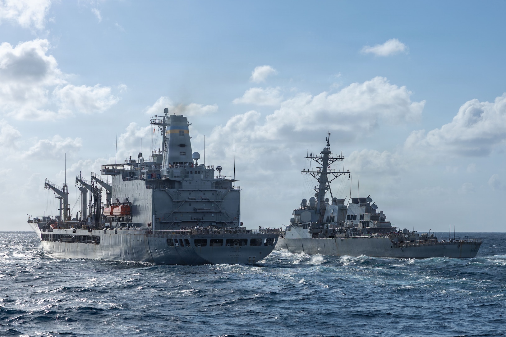 The Arleigh Burke-class guided-missile destroyer USS Ross (DDG 71) conducts a replenishment-at-sea with the Henry J. Kaiser-class replenishment oiler, USNS John Lenthall (T-AO 189) while underway in the Atlantic Ocean, Mar. 3, 2026. The George H.W. Bush Carrier Strike Group is at sea training as an integrated warfighting team. Composite Training Unit Exercise (COMPTUEX) is the Joint Force's most complex integrated training event and prepares naval task forces for sustained high-end Joint and combined combat. Integrated naval training provides combatant commanders and America's civilian leaders highly capable forces that deter adversaries, underpin American security and economic prosperity, and reassure Allies and partners. (U.S. Navy photo by Mass Communication Specialist 3rd Class Mark Peña)
