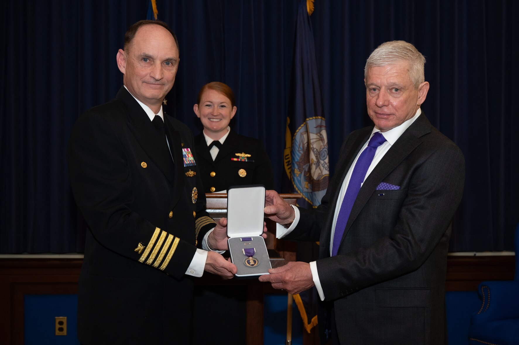 Thomas Tryon, receives the Purple Heart award for his father, Machinist’s Mate 3rd Class Joseph Tryon, from U.S. Navy Capt. Scott Wallace, Defense Contract Management Agency Northeast commander and ceremony presiding officer, during a ceremony at Hanscom Air Force Base, Mass., March 20. Tryon was posthumously approved for the award nearly 82 years after being injured during the World War II D-Day invasion. (U.S. Air Force photo by Todd Maki)