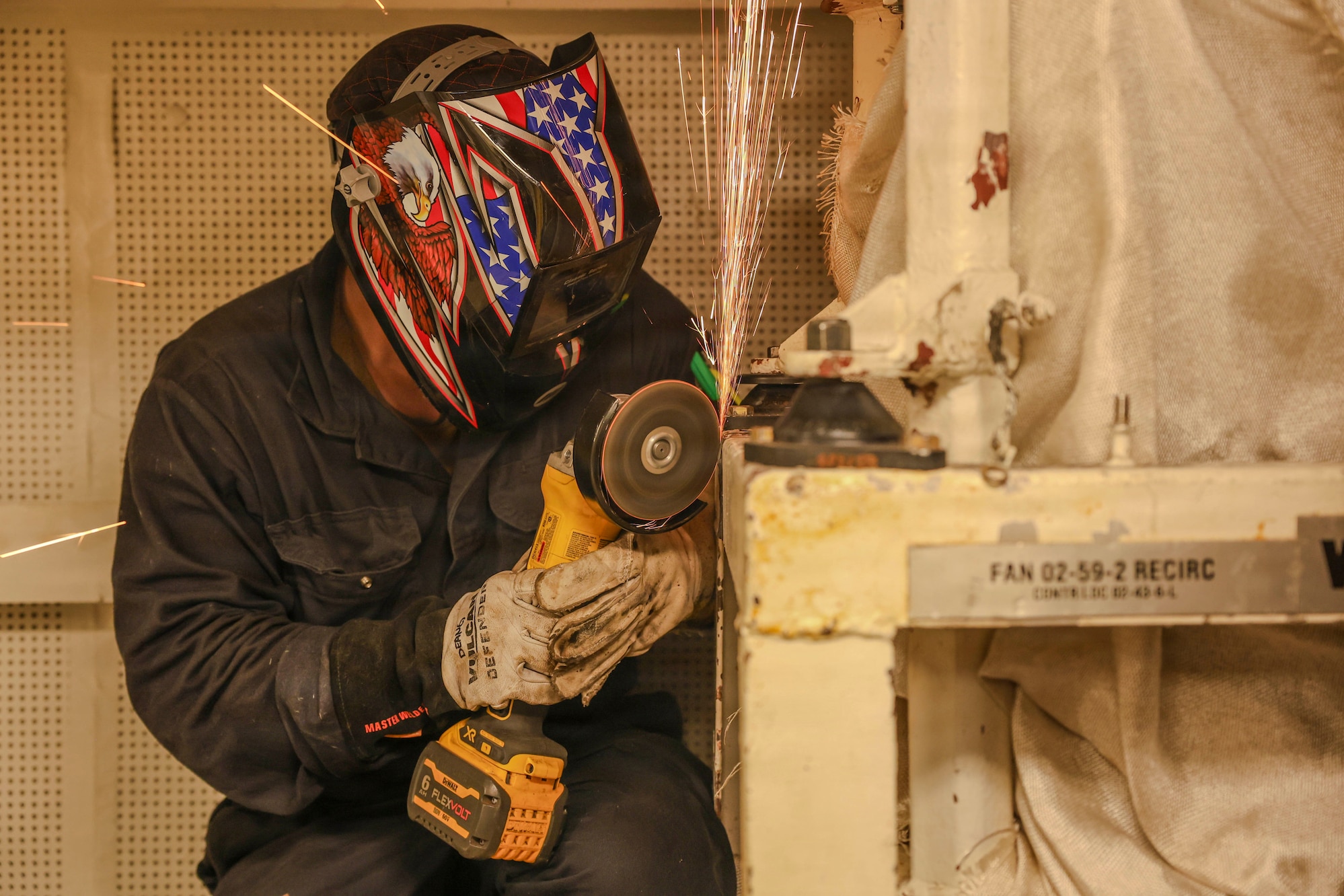 Hull Maintenance Technician 2nd Class Christian Deang, assigned to Southwest Regional Maintenance Center, grinds a fan unit bracket aboard Whidbey Island-class dock landing ship USS Ashland (LSD 48) as part of ship wartime repair and maintenance exercise (SWARMEX) in Cebu, Philippines, March 25, 2026. SWARMEX is designed to rehearse coordination and execution of ship damage repair from forward locations within the Indo-Pacific region, strengthening ties with the skilled workforce within allied and partner countries. (U.S. Navy photo by Mass Communication Specialist Seaman Maliq J. Martin)