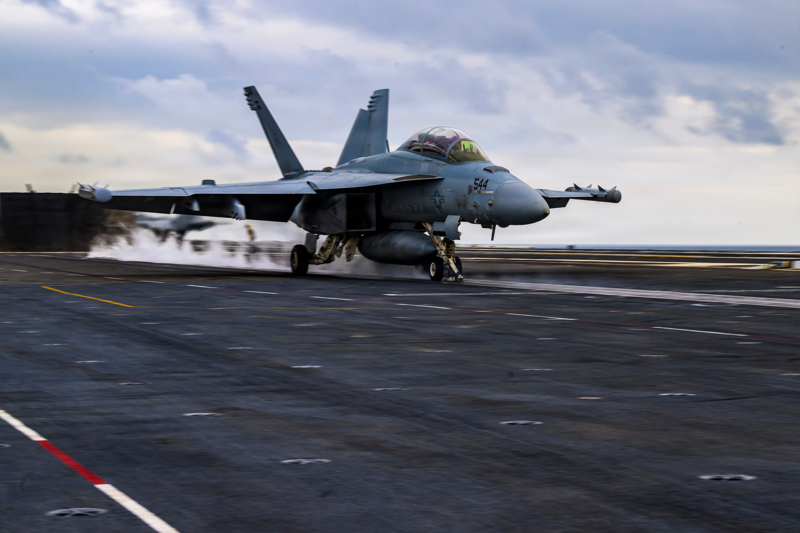 PACIFIC OCEAN (March 31, 2026) –U.S. Navy Capt. William Mathis, commanding officer of the Nimitz-class aircraft carrier USS Theodore Roosevelt (CVN 71), takes off in an E/A-18G Growler assigned to Electronic Attack Squadron (VAQ) 129, March 31, 2026. Theodore Roosevelt, flagship of Carrier Strike Group (CSG) 9, is underway conducting exercises to bolster strike group readiness and capability in the U.S. 3rd Fleet area of operations. (U.S. Navy Photo by Mass Communication Specialist 2nd Class Ryan Holloway)