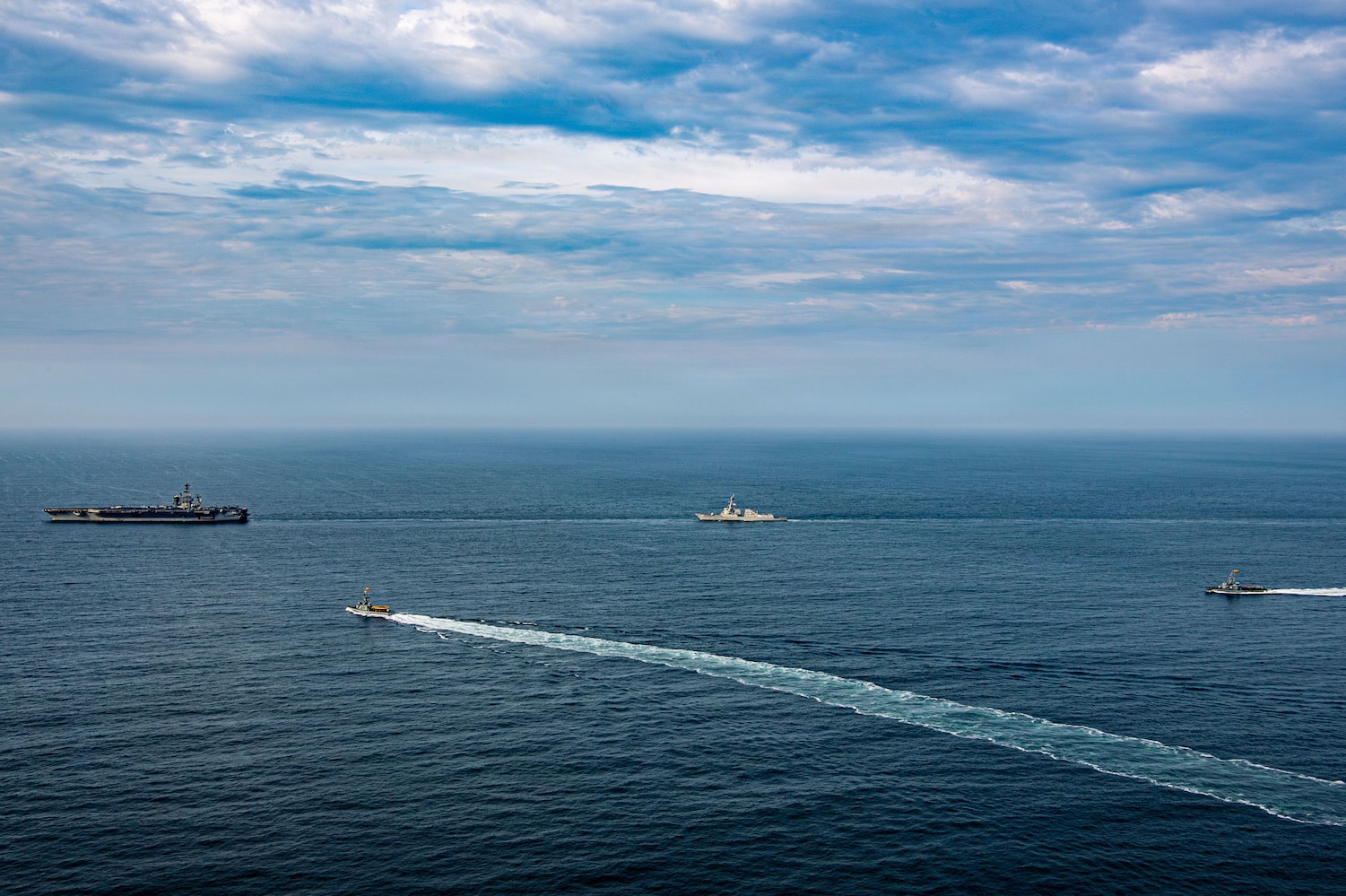 Ecuadorian Navy Esmeralda-class missile corvettes BAE Manabi (CM 12) and BAE Loja (CM 16) conduct formation maneuvering alongside Nimitz-class aircraft carrier USS Nimitz (CVN 68) and Arleigh Burke-class guided missile destroyer USS Gridley (DDG 101), part of Nimitz Carrier Strike Group (NIMCSG), in the Pacific Ocean, April 8, 2026. Nimitz is deployed as part of Southern Seas 2026 which seeks to enhance capability, improve interoperability, and strengthen maritime partnerships with countries throughout the region through joint, multinational and interagency exchanges and cooperation. (U.S. Navy photo by Mass Communication Specialist Seaman Apprentice Julian Jaime)