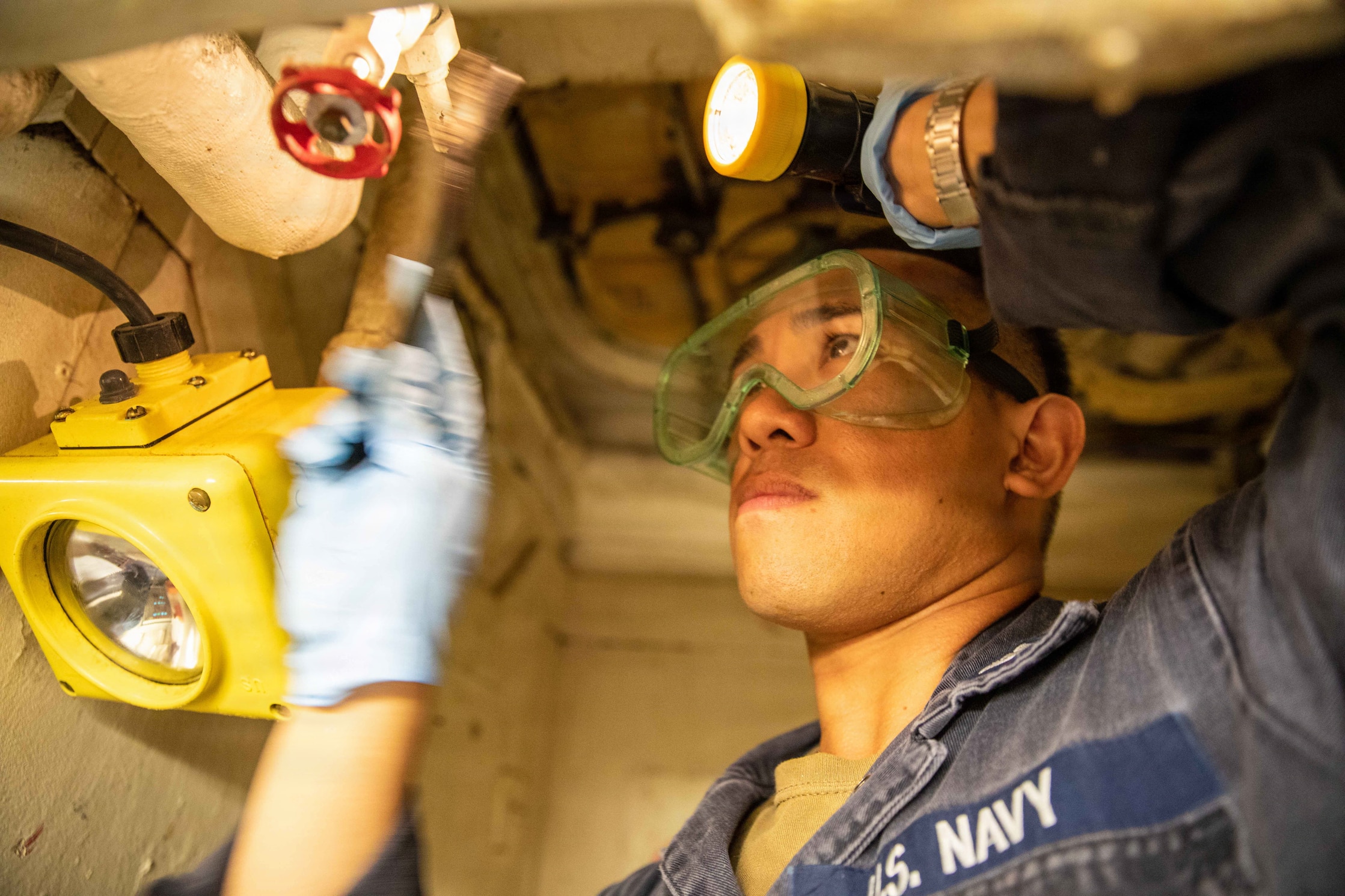 A U.S. Sailor conducts maintenance aboard Arleigh Burke-class guided-missile destroyer USS Mitscher (DDG 57), April 9, 2026. Mitscher is deployed to the U.S. 5th Fleet area of operations to support maritime security and stability in the Middle East.