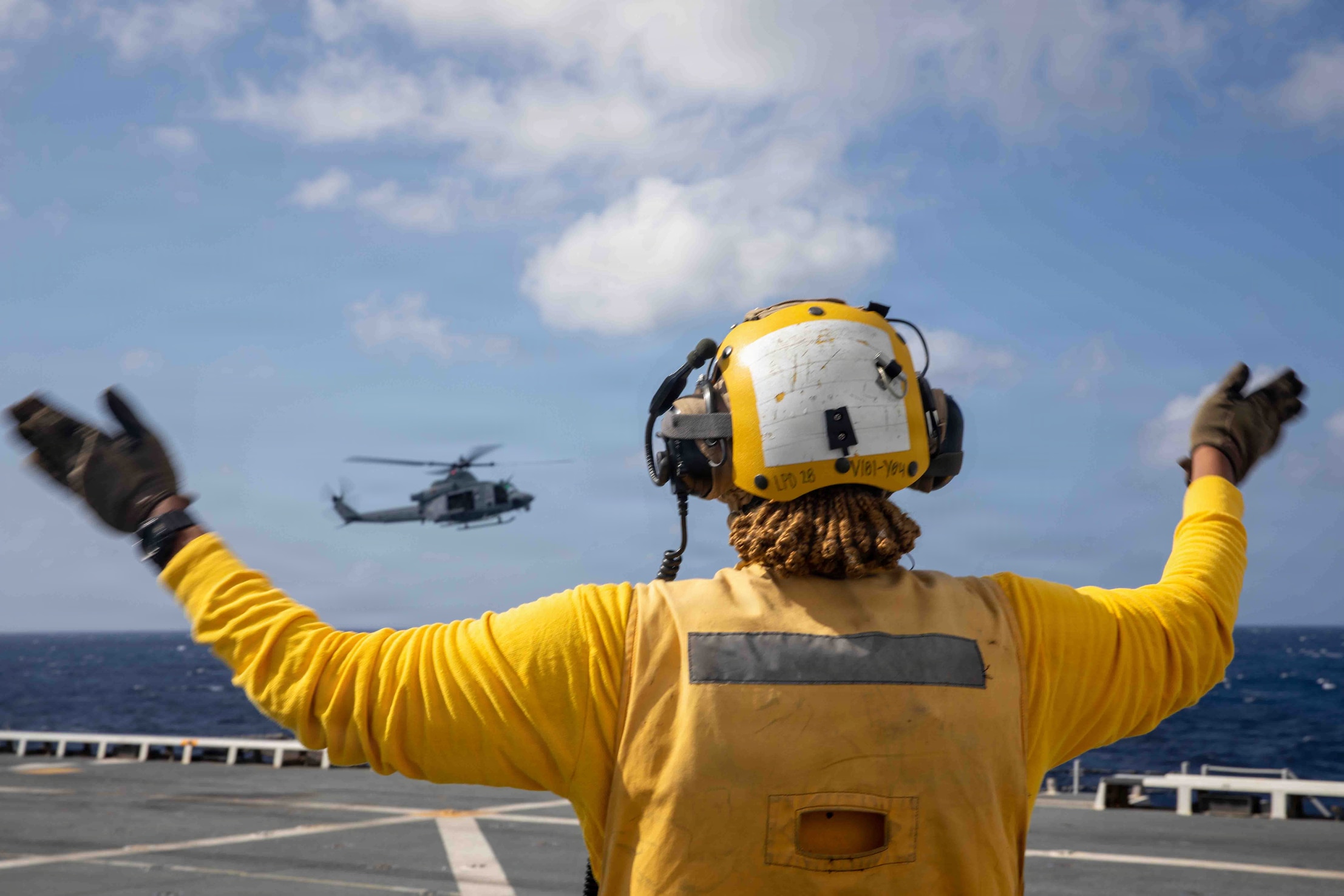 260227-N-FS947-1100 A U.S. Sailor, assigned to the Iwo Jima Amphibious Ready Group, signals to a UH-1Y Huey helicopter on the flight deck of San Antonio-class amphibious transport dock USS Fort Lauderdale (LPD 28) while underway in the Caribbean Sea Feb. 27, 2026. U.S. military forces are deployed to the Caribbean in support of the U.S. Southern Command mission, Department of War-directed operations, and the president’s priorities to disrupt illicit drug trafficking and protect the homeland. (U.S. Navy photo)
