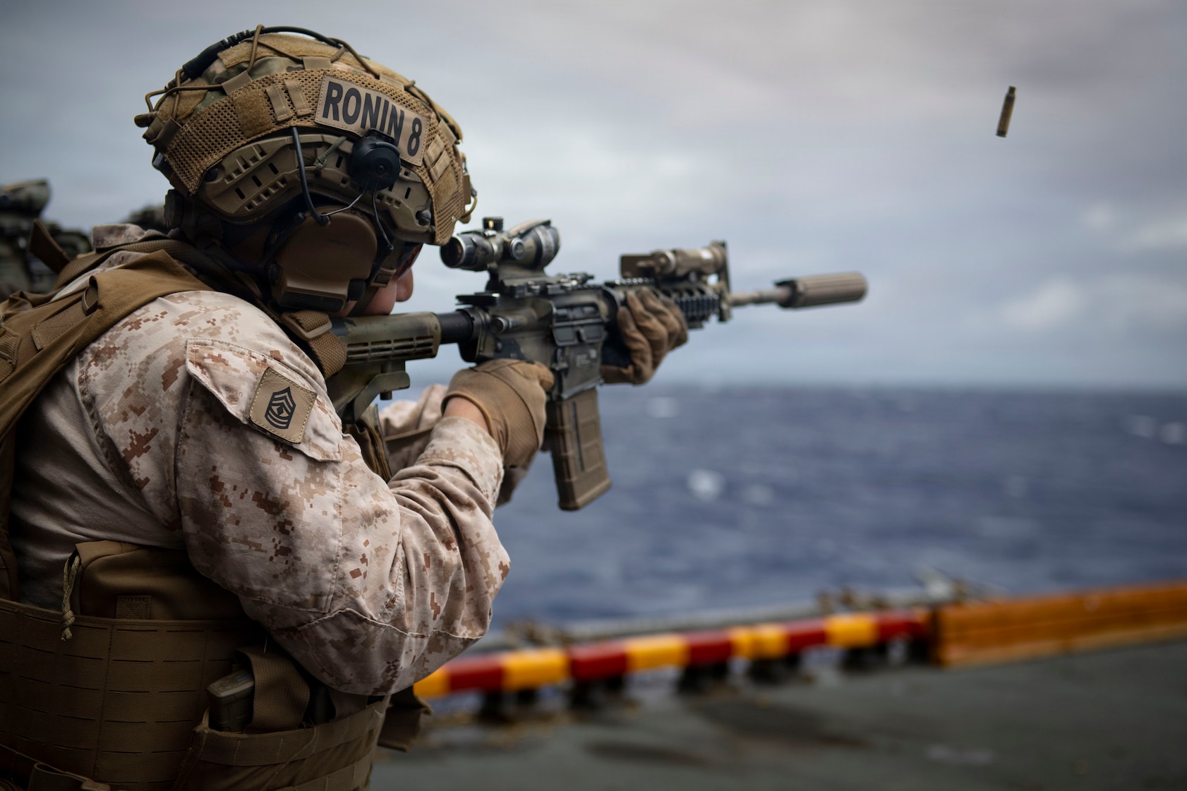 U.S. Marine Corps 1st Sgt. Wilmar Lopez-Montenegro, company first sergeant, India Company, Battalion Landing Team 3/5, 11th Marine Expeditionary Unit, fires an M4 carbine during marksmanship training in the hangar bay of Wasp-class amphibious assault ship USS Boxer (LHD 4), April 13, 2026. Boxer, flagship of the Boxer Amphibious Ready Group, is underway with the 11th MEU in the U.S. 7th Fleet area of operations. U.S. 7th Fleet, the Navy’s largest forward-deployed numbered fleet, routinely interacts and operates with allies and partners to preserve a free and open Indo-Pacific. (U.S. Navy photo by Mass Communication Specialist Seaman Apprentice Sailor O’Rear)