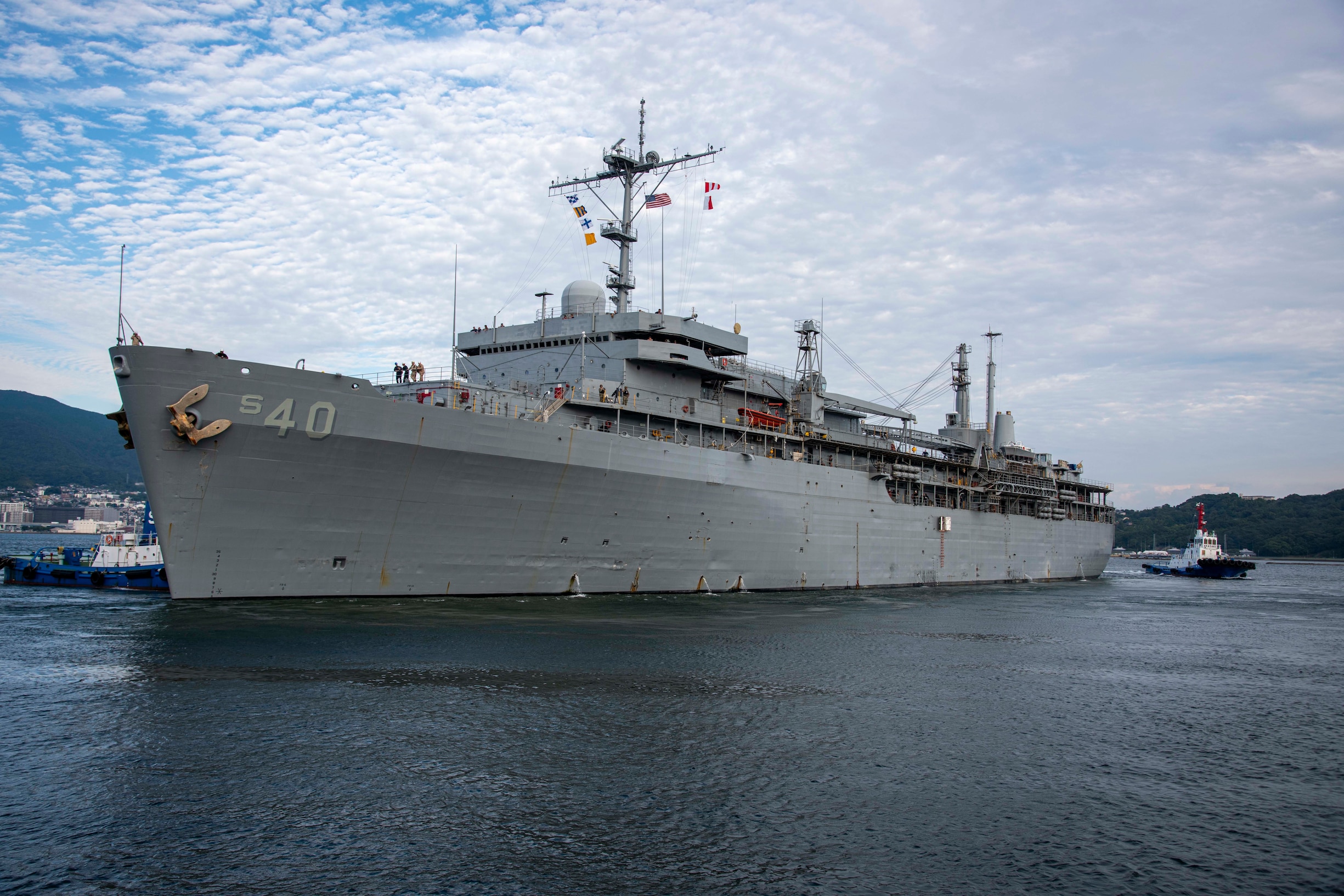 SASEBO, JAPAN (Oct. 16, 2024) The forward-deployed submarine tender USS Frank Cable (AS 40), departs Sasebo, Oct. 16, 2024. Frank Cable is supporting the U.S. 7th Fleet, the U.S. Navy’s largest forward deployed numbered fleet, operating with allies and partners in preserving a free and open Indo-Pacific region. (U.S. Navy photo by Mass Communication Specialist 1st Class Chase Stephens)