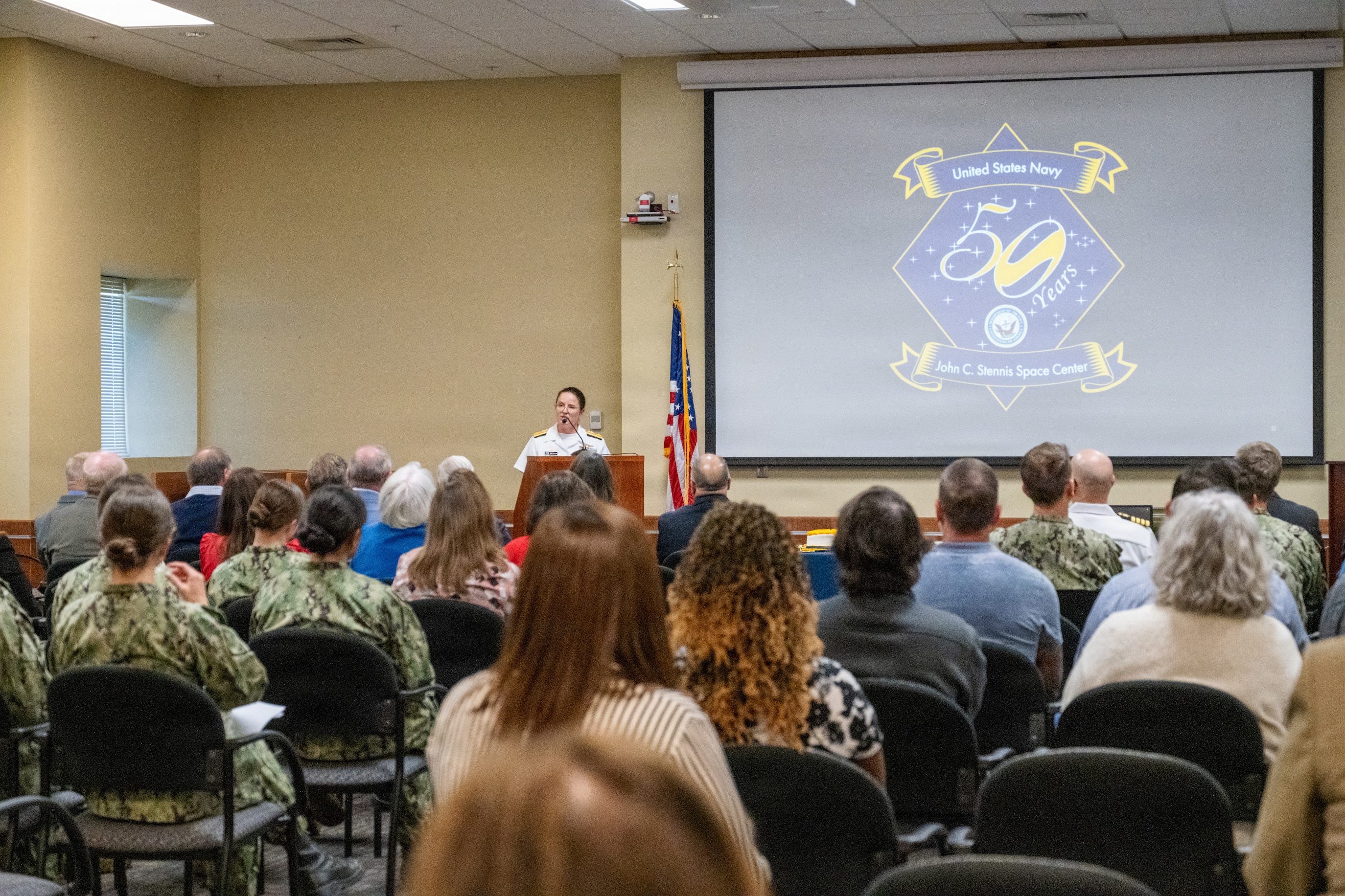 Rear Adm. Erin Acosta, commander, Naval Meteorology and Oceanography Command, welcomes attendees to the 50th Anniversary of Navy on Stennis ceremony on April 7, 2026. She spoke of the profound impact of modern naval warfare, highlighting how environmental intelligence is woven into every facet of operations. Naval Oceanography is a global force of approximately 2,900 military and civilian personnel. These dedicated professionals collect, process, and exploit environmental information from the seabed to the stars, enabling the Fleet and Joint Force to operate with confidence and precision across all domains - from the seabed to the stars.