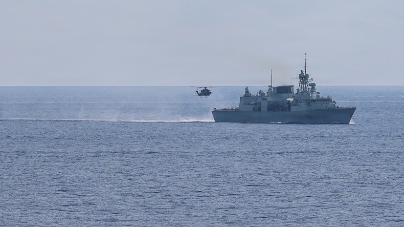 A Royal Canadian Air Force Super Puma lands on the flight deck of Halifax-class frigate HMCS Charlottetown (FFH 339) as the ship maneuvers into formation with Whidbey Island-class dock landing ship USS Ashland (LSD 48) after taking on fuel from Canadian supply ship MV Asterix during a multilateral exercise with the Royal Australian Navy and Royal Canadian Armed Forces in the South China Sea, April 14, 2026. Ashland and embarked Sailors and Marines from Task Force Ashland are a flexible crisis response force, purpose-built to integrate with allies and partners in support of a free and open Indo-Pacific. This forward deployment demonstrates the unwavering U.S. commitment to regional security and stability. U.S. 7th Fleet, the U.S. Navy’s largest forward-deployed numbered fleet, routinely interacts and operates with allies and partners in preserving a free and open Indo-Pacific. (U.S. Navy photo by Mass Communication Specialist 1st Class John B. Hetherington)