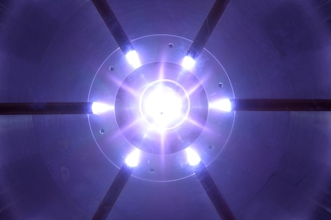 Six plasma guns shoot Teflon plasma towards the central axis of a plasma-filled rod pinch diode. This pulsed power device, developed by the U.S. Naval Research Laboratory, produces an intense, fast x-ray pulse, enabling new capabilities for radiography of military materials and components. (U.S. Navy photo)