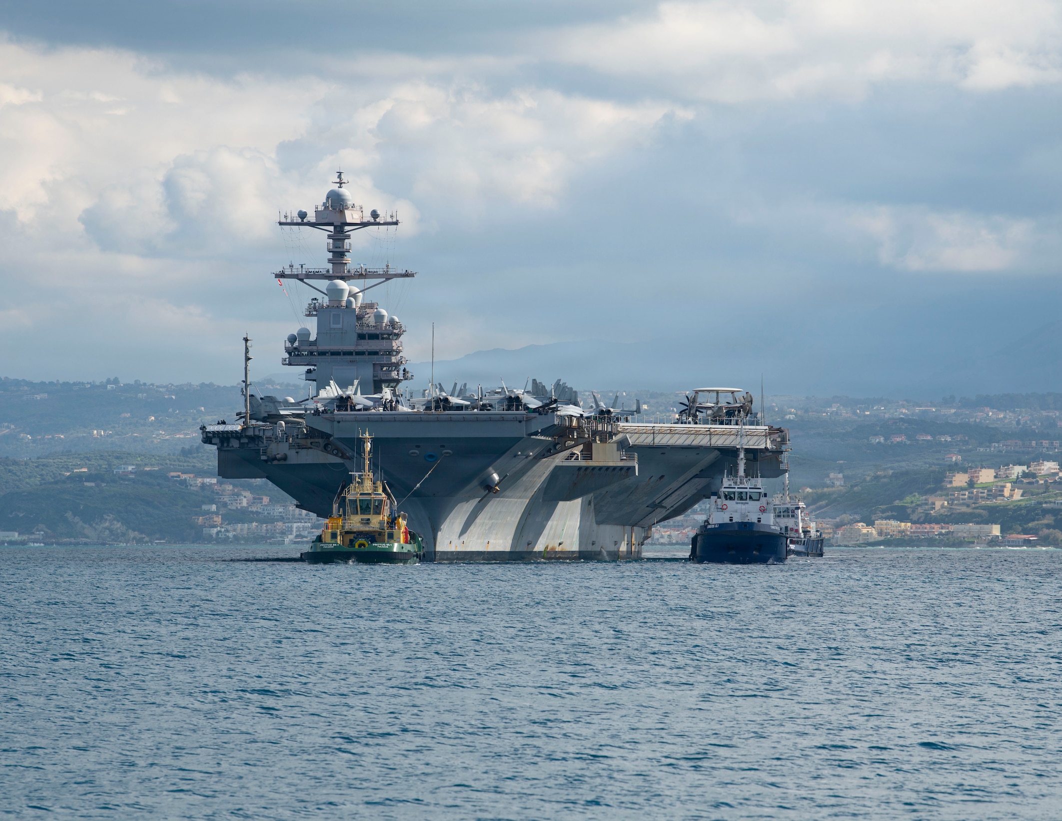 NAVAL SUPPORT ACTIVITY SOUDA BAY, Greece (Feb. 23, 2026) The world’s largest aircraft carrier, Ford-class aircraft carrier USS Gerald R. Ford (CVN 78) arrives at the NATO Marathi Pier Complex in Souda Bay, Crete, Greece, during a scheduled port visit on Feb. 23, 2026. NSA Souda Bay is an operational ashore installation that enables and supports U.S., Allied, Coalition, and partner nation forces to preserve security and stability in the European, African, and Central Command areas of responsibility. (U.S. Navy photo by Mass Communication Specialist 3rd Class Hannah Donahue)