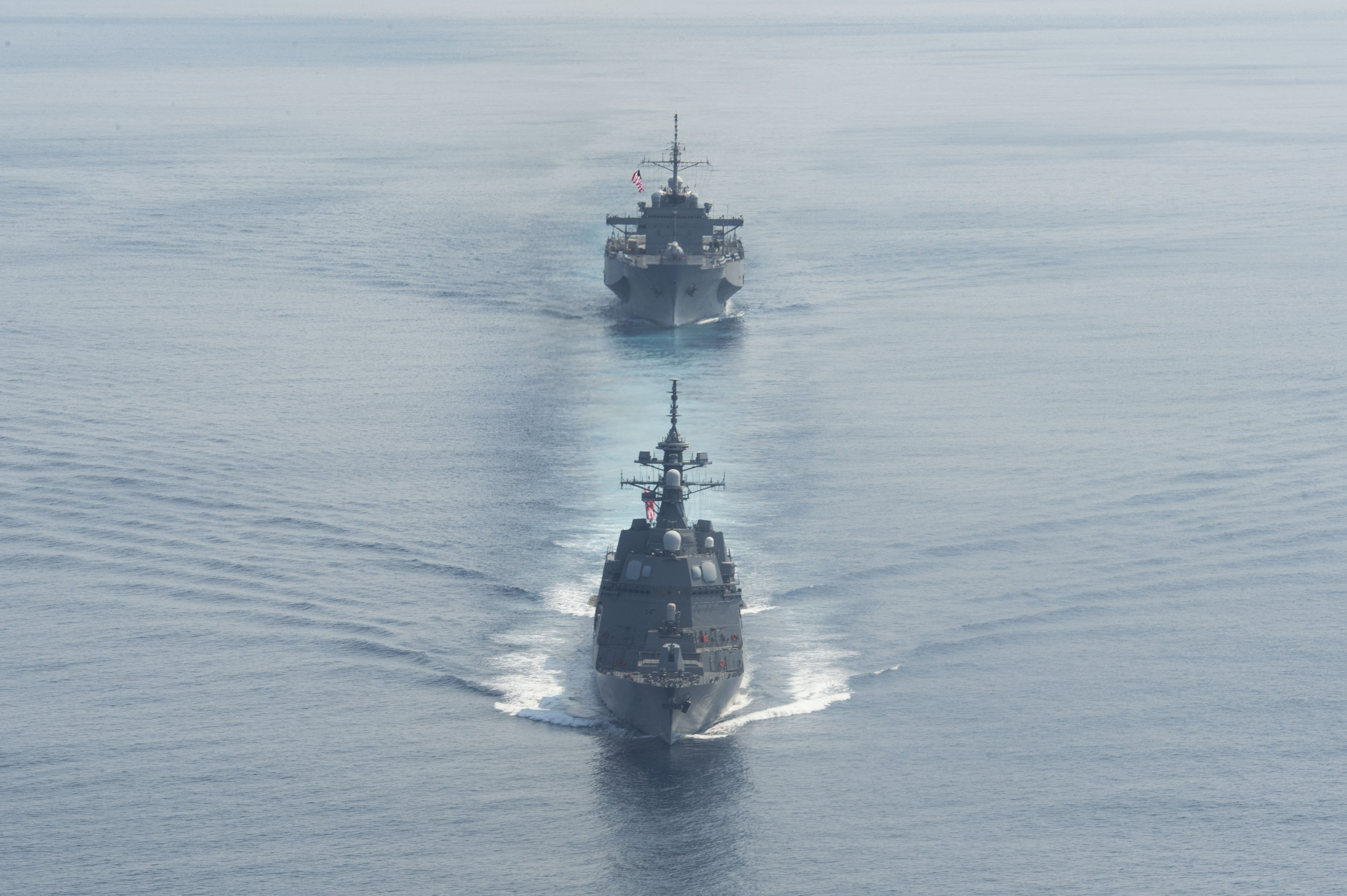 Japan Maritime Self-Defense Force (JMSDF) Asahi-class destroyer JS Asahi (DD-119) and U.S. 7th Fleet flagship USS Blue Ridge (LCC 19) conduct a group sail during a bilateral exercise in the South China Sea, April 16, 2026. U.S. 7th Fleet, the Navy’s largest forward-deployed numbered fleet, routinely interacts and operates with allies and partners in preserving a free and open Indo-Pacific. (U.S. Navy photo by Mass Communication Specialist 3rd Class Damian Cook)